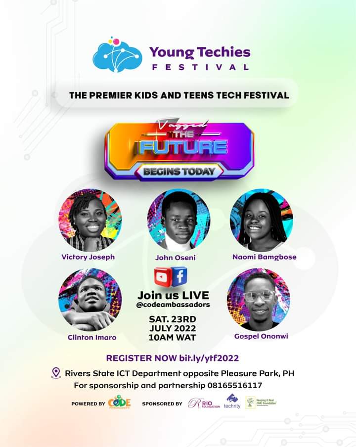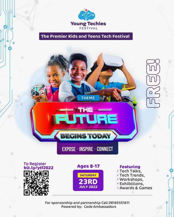 It aims to EXPOSE them to the world of tech, INSPIRE them to be the best they can be, and CONNECT them with other kids of like passion. With the theme tagged: THE FUTURE BEGINS TODAY. The event is slated to host on the 23rd of July, 2022 by 10 am prompt at Rivers State ICT Department(Tech Creek), opposite Pleasure Park, Port Harcourt.