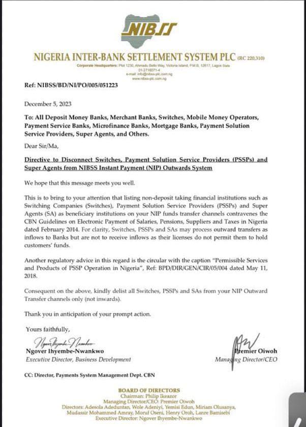 The big instruction is to stop certain types of money movements between different money systems. This affects Switches, Payment Solution Service Providers (PSSPs), and Super Agents in Nigeria. These are the behind-the-scenes players that help money move around quickly.